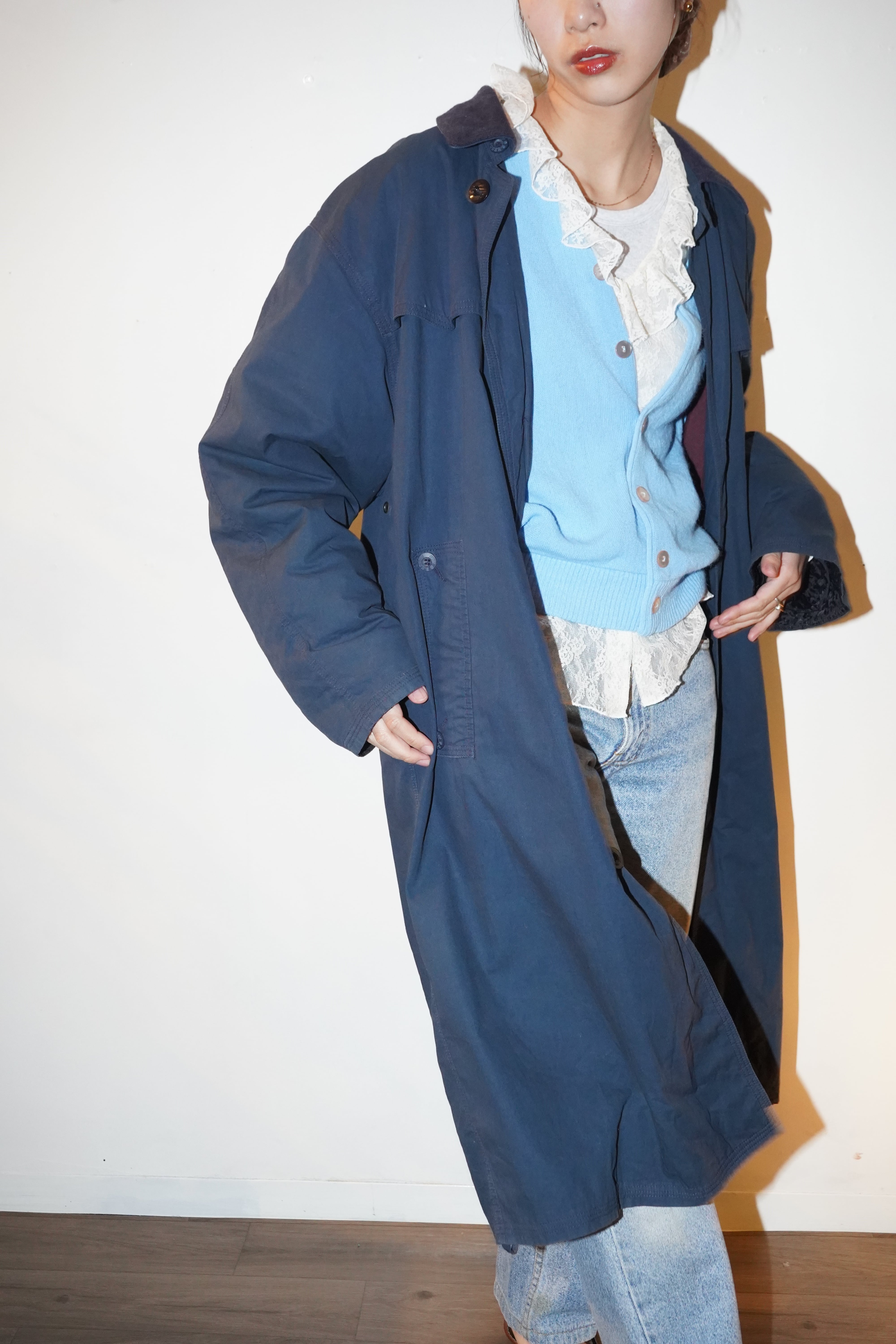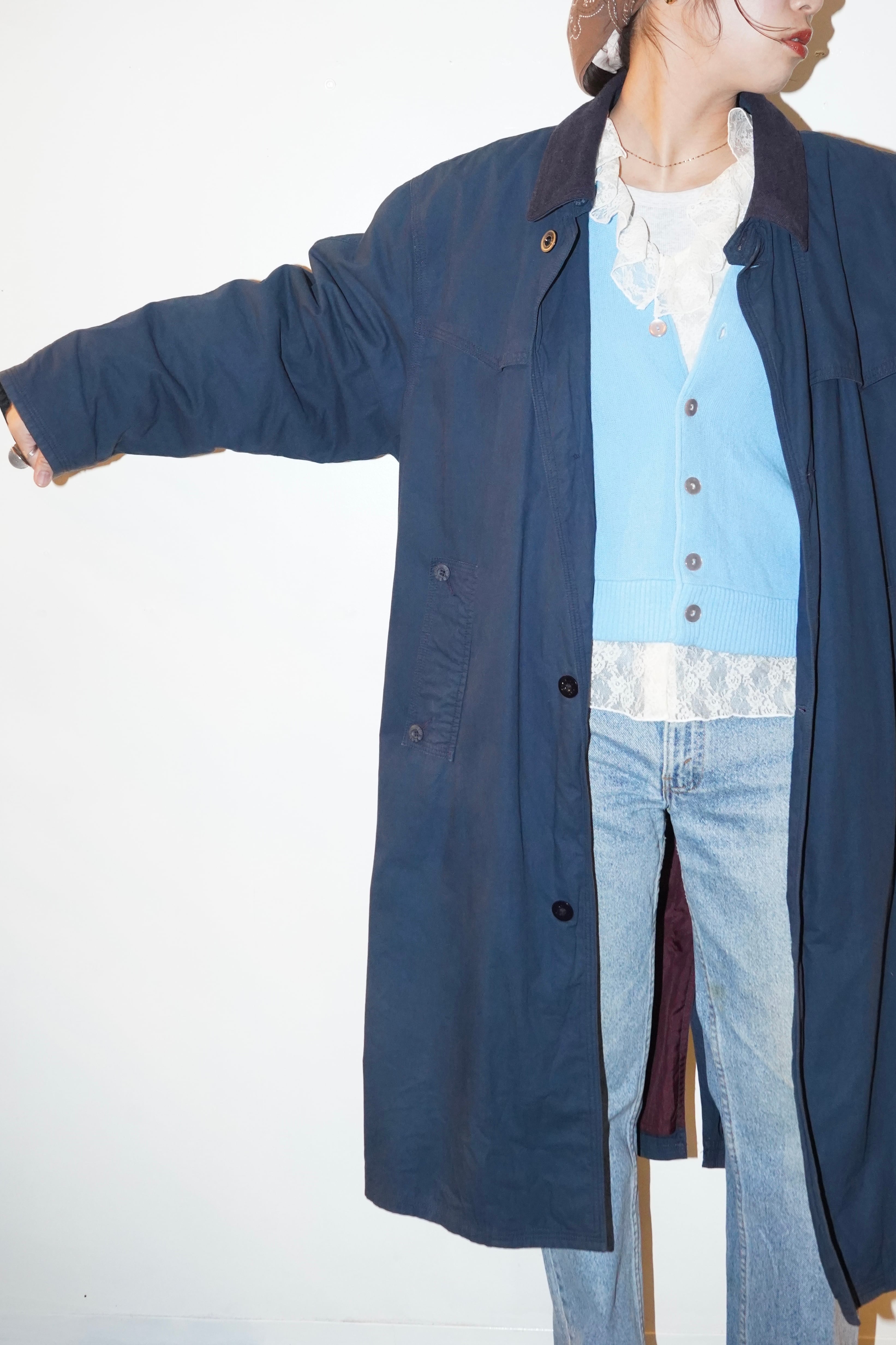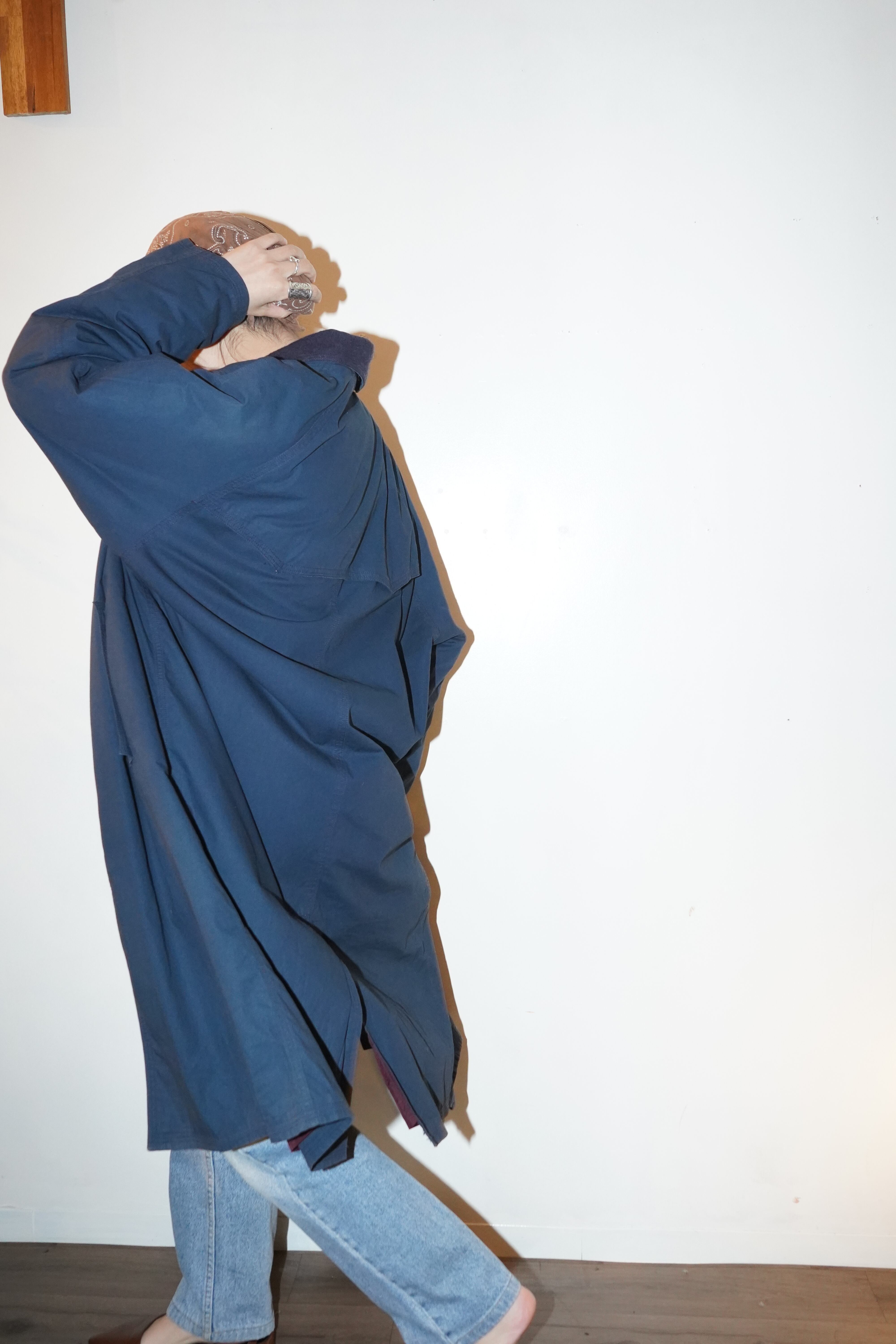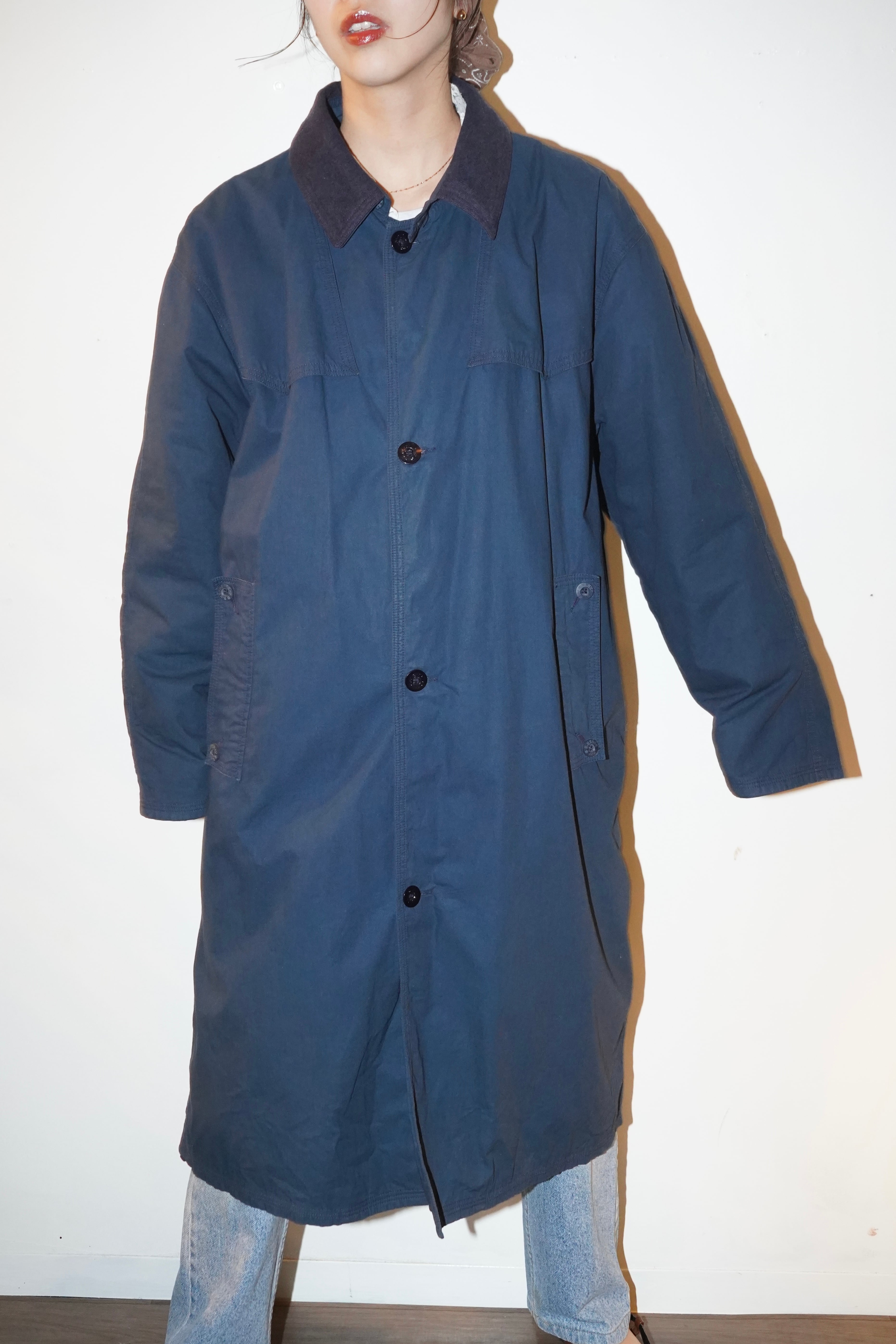 collar switching long coat in navy