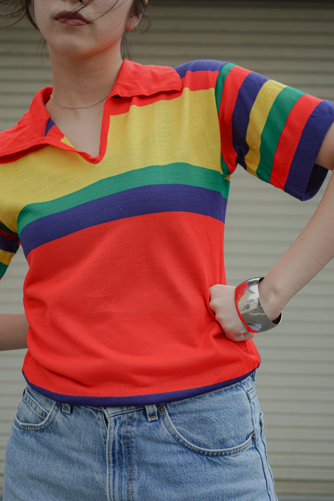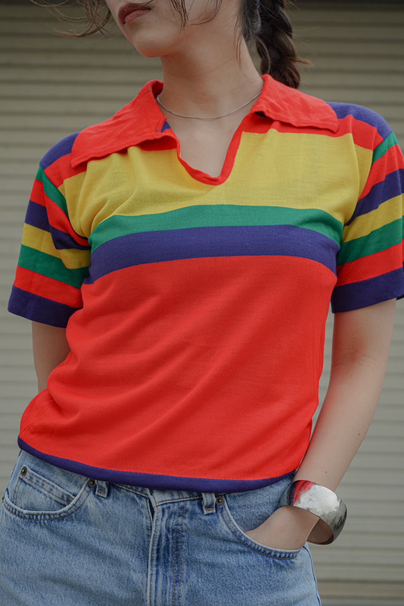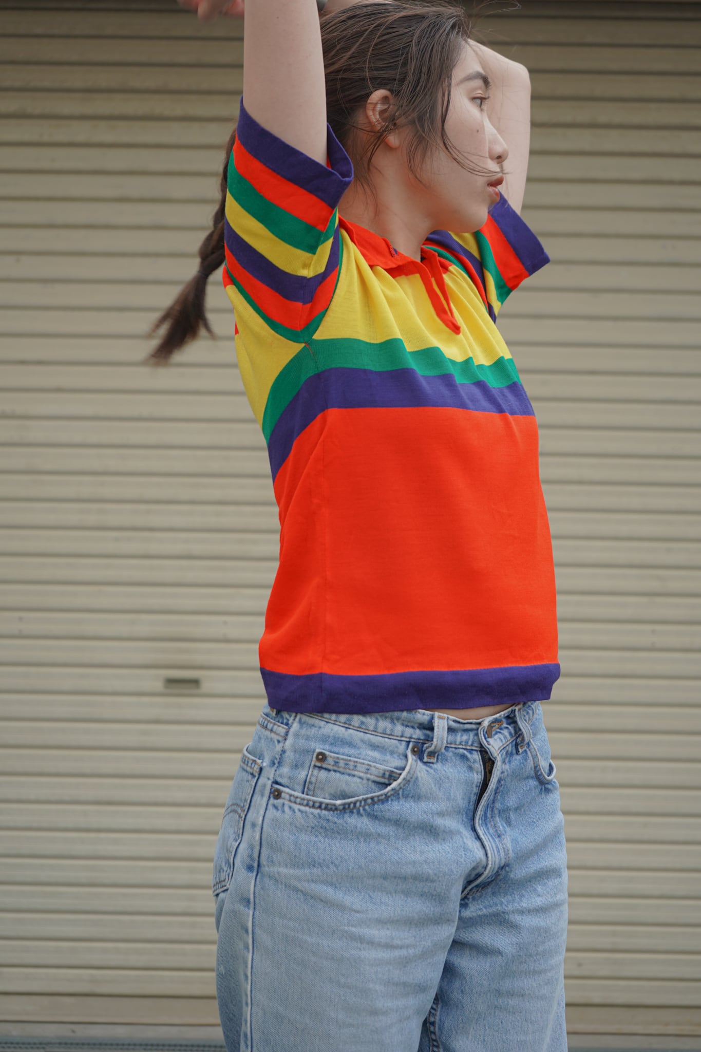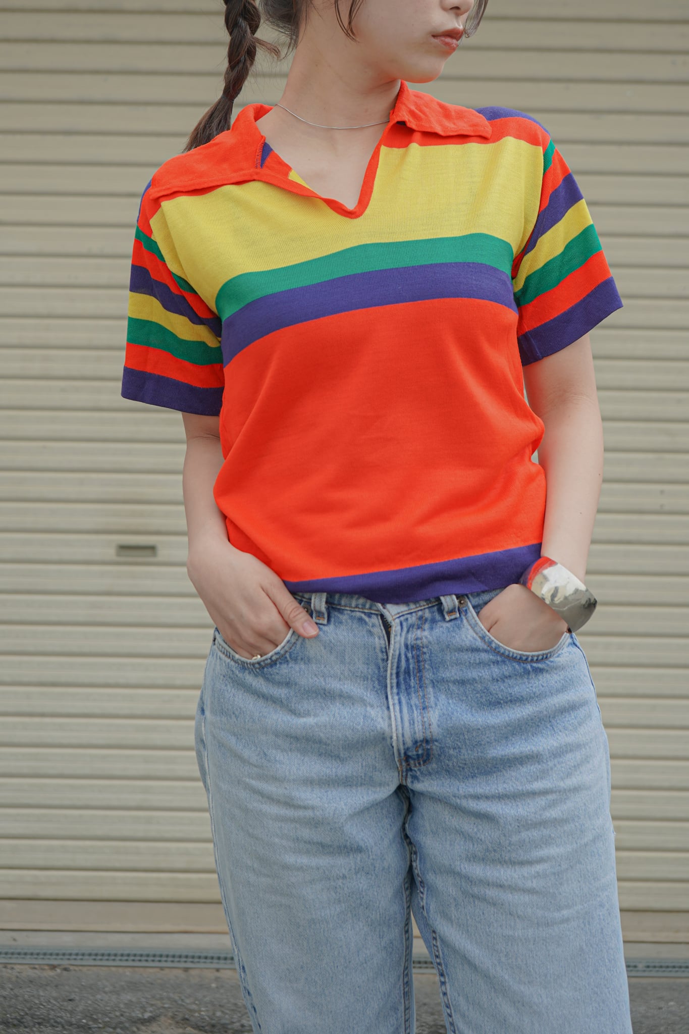 発色の良い、ビビットカラーのマルチボーダートップス。サラッと通気性の良いサマーニット素材で素肌でも心地よい着心地◎ 胸元がスッキリ空いておりラフな抜け感も演出してくれます。
